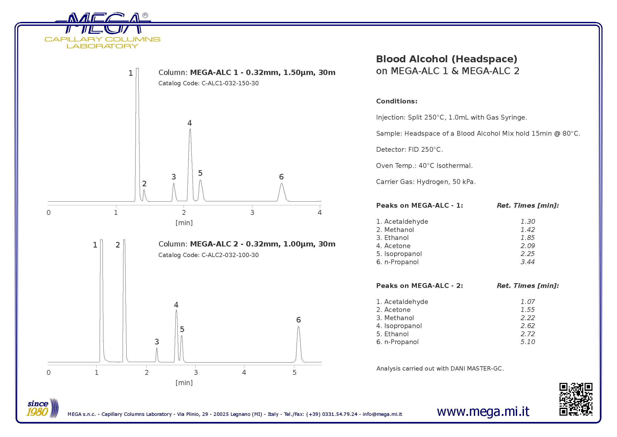 依據相關國家標準《中華人民共和國公共安全行業標準:血液酒精含量的檢驗方法》(GA/T 842-2009)和《司法鑒定技術規范:血液中乙醇的測定 頂空氣相色譜法》(SF/Z JD0107001-2010)的規定,我們向您推薦使用具有30多年專業生產和研發石英毛細管柱的企業-意大利MEGA公司產品:MEGA-ALC2,其具有的特點: