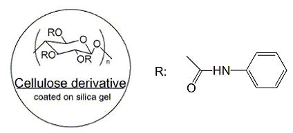纖維素型是使用最廣泛的手性柱之一,纖維素型手性色譜柱的分離作用包括相互吸引的作用及形成包埋復合物。它們屬于Wainer分類中的第2種類型。市售的手性色譜柱為微晶三醋酸基、三安息香酸基、三苯基氨基酸鹽纖維素固定相。很多化合物可通過此類型的色譜柱得到分離。這種類型的手性色譜柱種類也很齊全。流動相使用低極性溶劑,典型的流動相為異丙醇-正己烷混合物。這類柱子根據制作工藝,分為涂敷與鍵合兩大類。但特別要注意由于氯可以使涂敷纖維素從硅膠上脫落,因此要確保涂敷類柱子流動相中無含氯溶劑。