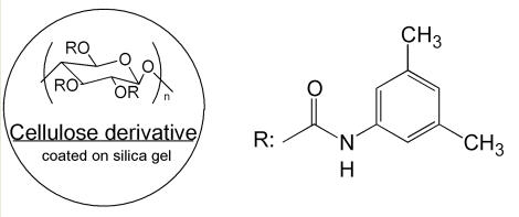 纖維素型是使用最廣泛的手性柱之一,纖維素型手性色譜柱的分離作用包括相互吸引的作用及形成包埋復合物。它們屬于Wainer分類中的第2種類型。市售的手性色譜柱為微晶三醋酸基、三安息香酸基、三苯基氨基酸鹽纖維素固定相。很多化合物可通過此類型的色譜柱得到分離。這種類型的手性色譜柱種類也很齊全。流動相使用低極性溶劑,典型的流動相為異丙醇-正己烷混合物。這類柱子根據制作工藝,分為涂敷與鍵合兩大類。但特別要注意由于氯可以使涂敷纖維素從硅膠上脫落,因此要確保涂敷類柱子流動相中無含氯溶劑。