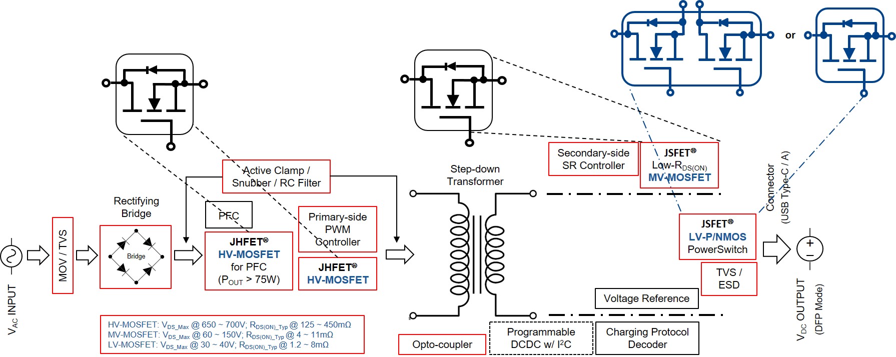 輸出功率從 18W 到 100W (甚至 120W 或更大) 、支持快充協(xié)議 (USB PD3.0/3.1, USB BC1.2, UFCS T/TAF 083-2022, Qualcomm QCxx, MediaTek PExxx、Huawei S/FCP, Oppo D/FCP, Samsung AFC, Apple 2.4A, …)、配置一個或多個 USB Type-A 及 Type-C 輸出接口的快充充電器日益普遍。它們可以一物多用,同時為智能手機、平板、智能手表及筆記本電腦等萬物互聯(lián)數(shù)字化終端里面的鋰電池快速充電。采用第三代半導體功率器件(氮化鎵 D/E-mode HEMT)的設計,體積小巧以及使用時溫度不會燙手,由于因近年多家世界排名前列的智能手機 OEM 不把充電器隨著新款手機一起標配而形成曲棍球棒效應,使得這類小巧的快充充電器成為市場主流。 市場上的快充充電器,常用的交直流電源轉換拓撲是 Flyback 及 LLC。Flyback 拓撲常見于功率比較小的設計,LLC 拓撲則常見于功率較大及對交直流電源轉換效率要求較高的設計。因為 BOM 相對 LLC 拓撲比較簡單,ACF-Flyback 拓撲也開始被中/小功率的設計采用,特別是初級使用高壓氮化鎵 HEMT 的設計。無論是那種拓撲,快充充電器的內部結構示意圖大概如上: 針對快充充電器的成用,捷捷微電 能提供完整的分立器件解決方案。比如,AC 輸入端防浪涌的 MOV、TVS、鉗制變壓器漏感而對原邊的高壓 MOSFETs VDS_Max 產生過壓的快恢復整流管、原邊 PFC (75W 以上的設計) 和匹配 PWM 的高壓 MOSFET、副邊同步整流中/低壓 MOSFETs、USB Type-A 及Type-C 端口的低壓 MOSFETs 及 ESD 保護等。