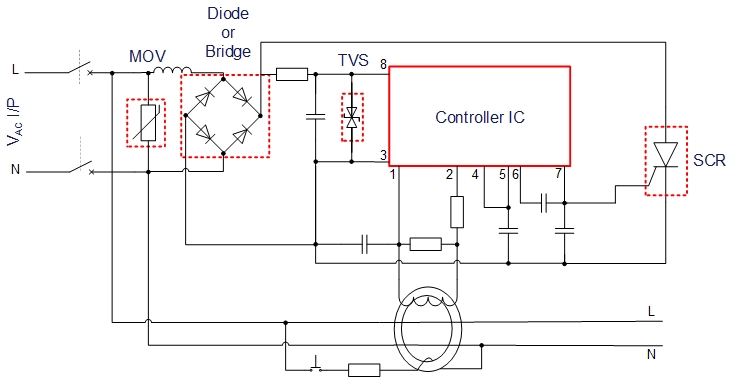 漏電保護器,簡稱漏電開關(guān),又叫漏電斷路器,主要是用來在設(shè)備發(fā)生漏電故障時以及對有致命危險的人身觸電保護,具有過載和短路保護功能,可用來保護線路或負載的過載和短路,亦可在正常情況下作為線路的不頻繁轉(zhuǎn)換啟動之用。 目前市場上使用的漏電保護裝置種類繁多,但大體的原理都相差不大。漏電保護器主要是由三部分組成:檢測元件、中間放大環(huán)節(jié)、操作執(zhí)行機構(gòu) 1. 檢測元件:由電流互感器組成,檢測漏電電流并發(fā)出信號 2. 放大環(huán)節(jié):將微弱的漏電信號放大,按裝置不同可采用機械式或電子式 3. 執(zhí)行機構(gòu):收到信號可控硅由斷開狀態(tài)變?yōu)閷?dǎo)通狀態(tài),主線圈通電后,主開關(guān)由閉合狀態(tài)轉(zhuǎn)換為斷開狀態(tài),從而切斷電源 應(yīng)用于漏電保護器領(lǐng)域,捷捷微電 能提供比較齊全的元件解決方案。比如:AC 輸入端防浪涌的壓敏電阻(MOV)、對交流進行整流的高壓整流二極管 (Diode) 或者是整流橋(Bridge)、對電源端進行過壓防護的瞬態(tài)抑制二極管(TVS)、整個電路的控制核心集成電路(IC)、電路動作執(zhí)行機構(gòu)(SCR)等。