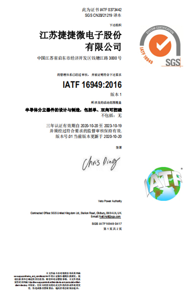 IATF 16949:2016 自2016年起開始參與汽車 16949 認(rèn)證。我們的 IATF 16949 認(rèn)證的范圍是“半導(dǎo)體分立器件的設(shè)計(jì)與制造,包括單、雙向可控硅”。參與認(rèn)證的制造工廠的認(rèn)證證書如下