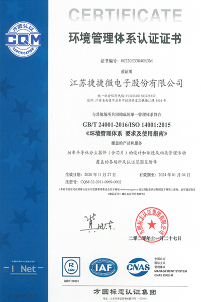 ISO 14001 江蘇捷捷微電子股份有限公司已取得 ISO 14001:2015 標(biāo)準(zhǔn)要求的企業(yè)認(rèn)證,包括以下工廠已通過獨(dú)立認(rèn)證)