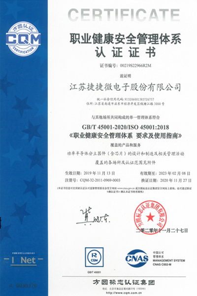 ISO 45001 江蘇捷捷微電子股份有限公已取得 ISO 45001:2018 標(biāo)準(zhǔn)要求的企業(yè)認(rèn)證,包括以下工廠(已通過獨(dú)立認(rèn)證)