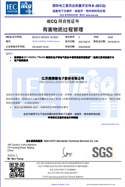 QC080000 江蘇捷捷微電子股份有限公已取得QC080000有害物質(zhì)過程管理的企業(yè)認(rèn)證,包括以下工廠(已通過獨(dú)立認(rèn)證)