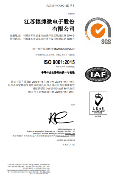 ISO 9001:2015 江蘇捷捷微電子自 2000年起建立了ISO 9001 質(zhì)量管理體系。