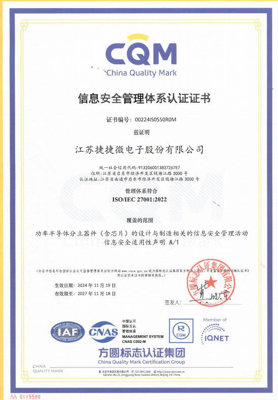ISO 27001:2022 江蘇捷捷微電子自 2024年起獲得了ISO:27001證書。